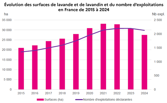 La récolte 2025 s’est révélée pour le moins atypique. Démarrée avec une dizaine de jours d’avance, autour du 20 juin sur le Plateau de Valensole, elle a été également plus courte que les années précédentes. Les baisses de rendements annoncées fin juillet se confirment : de l’ordre de -20% sur le Lavandin, et de -15% sur la Lavande, allant jusqu’à -50% sur la Lavande Fine de Population dans certaines exploitations. Malgré une pluviométrie printanière prometteuse, les fortes chaleurs de mai et juin ont épuisé la réserve en eau utile du sol, perturbé la floraison et favorisé le développement de ravageurs, notamment des chenilles de noctuelle et de la cicadelle, avec une présence encore plus forte sur le Plateau d’Albion. Les orages de juillet, trop tardifs, ont parfois causé des dégâts, tout en permettant cependant un redémarrage végétatif après récolte. Cette baisse de rendements s’ajoute à une réduction continue des surfaces cultivées, conséquence directe de quatre années de marché tendu : des prix de vente inférieurs aux coûts de revient, qui ont conduit à un épuisement progressif des stocks accumulés lors des périodes de surproduction. Aujourd’hui, la surface en Lavandin passe sous la barre des 20 000 hectares, un niveau inférieur à celui de 2019, avec une surface en Lavande de l’ordre de 7 000 hectares.